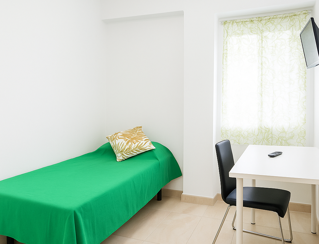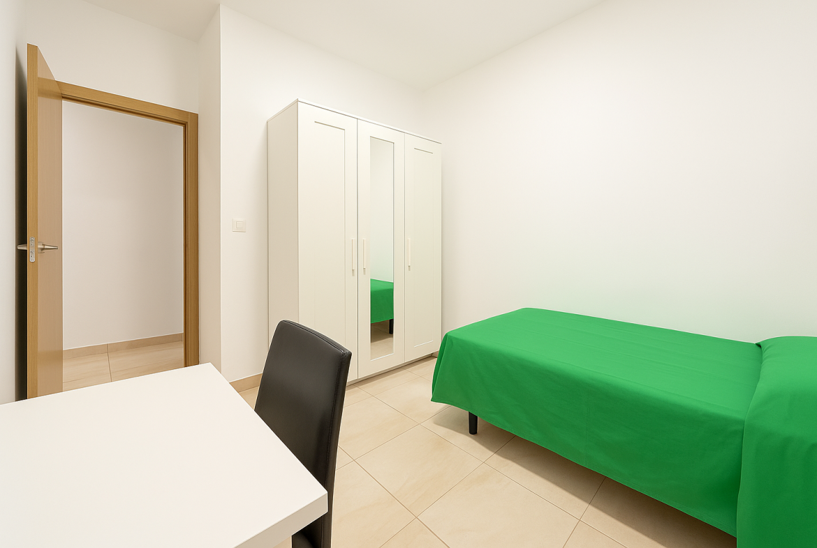 - ✓ cama individual de 90 cm, armario de mediano tamaño, escritorio, ventilador techo,