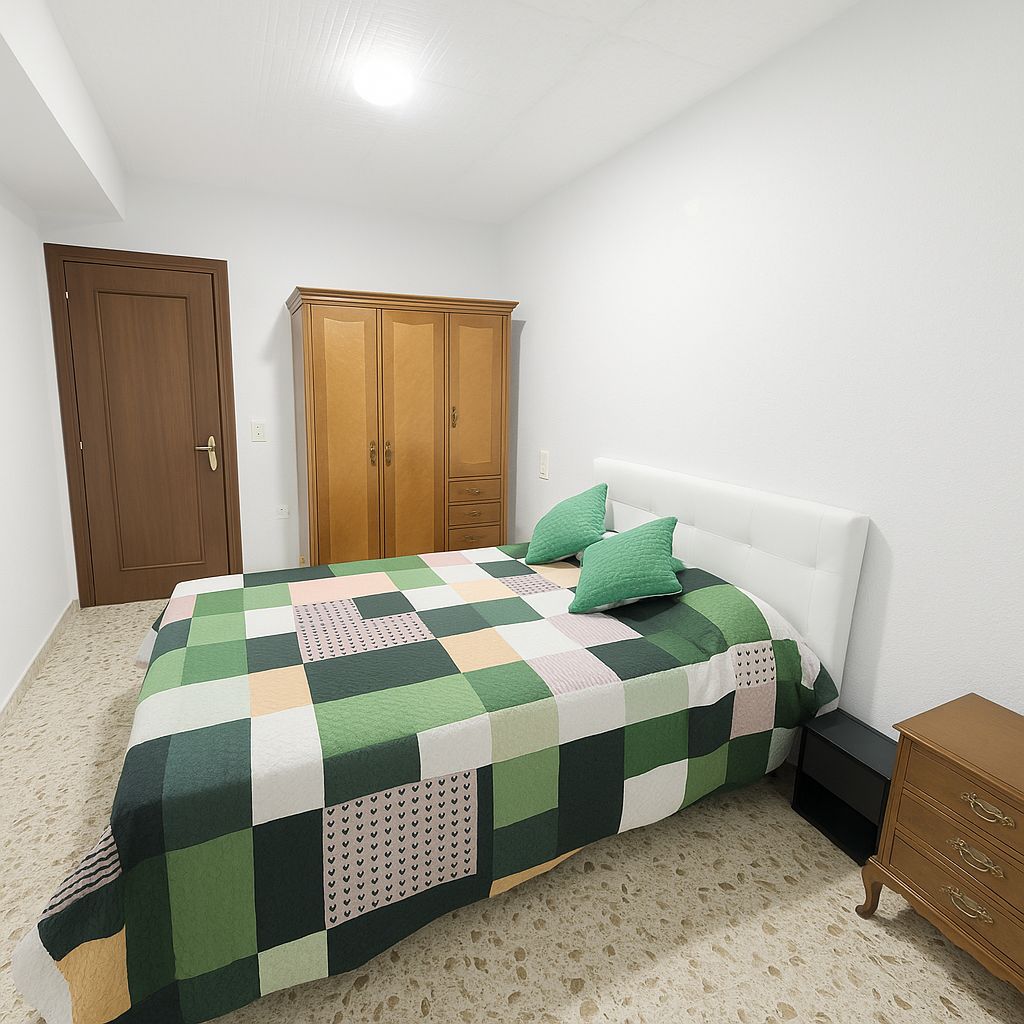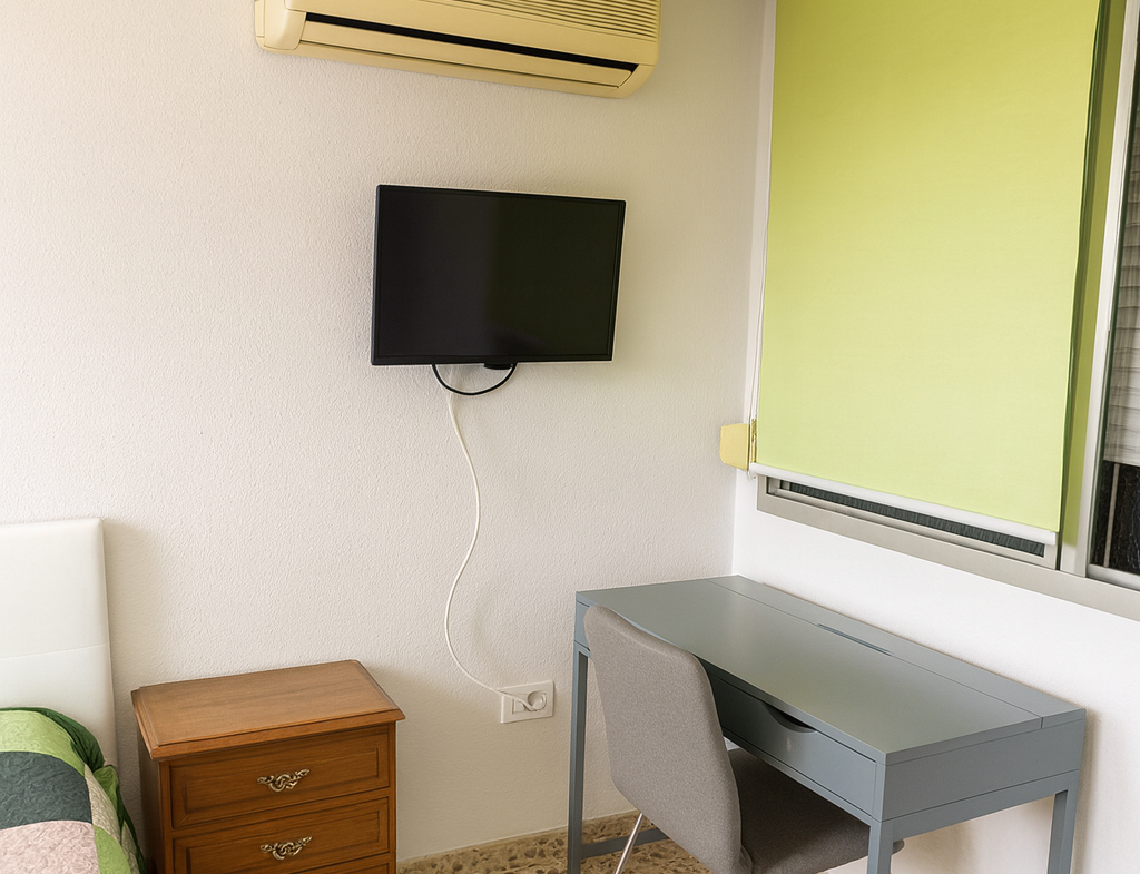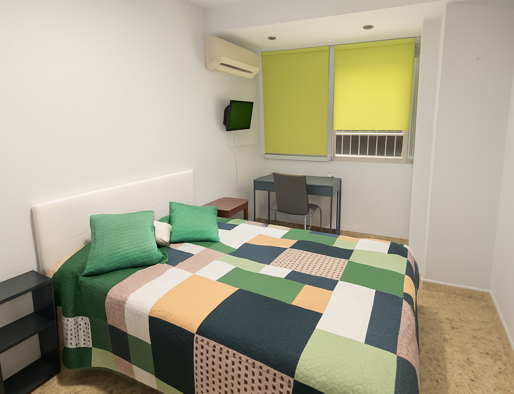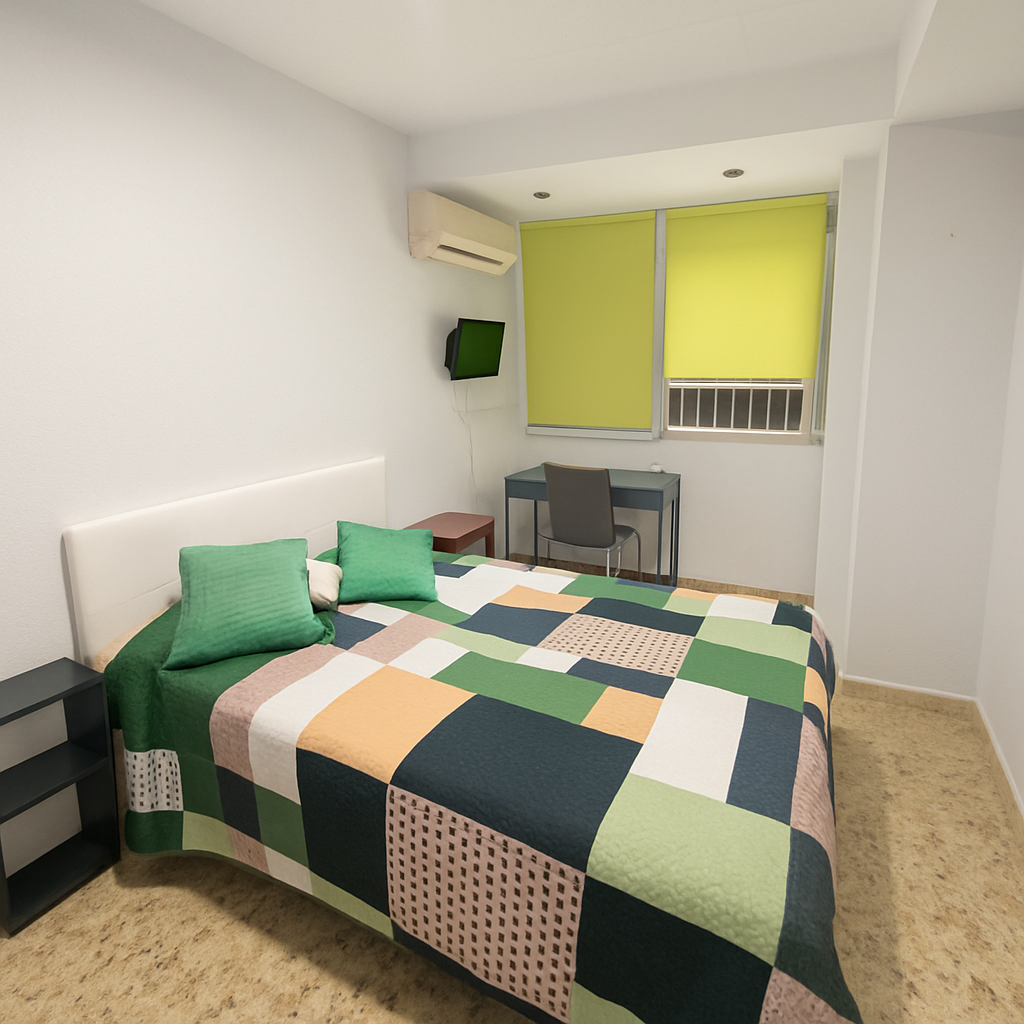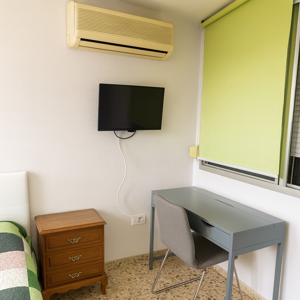 • Cama matrimonio 135 cm, 2 armarios (uno en habitación, otro en pasillo), escritorio con silla, aire acondicionado