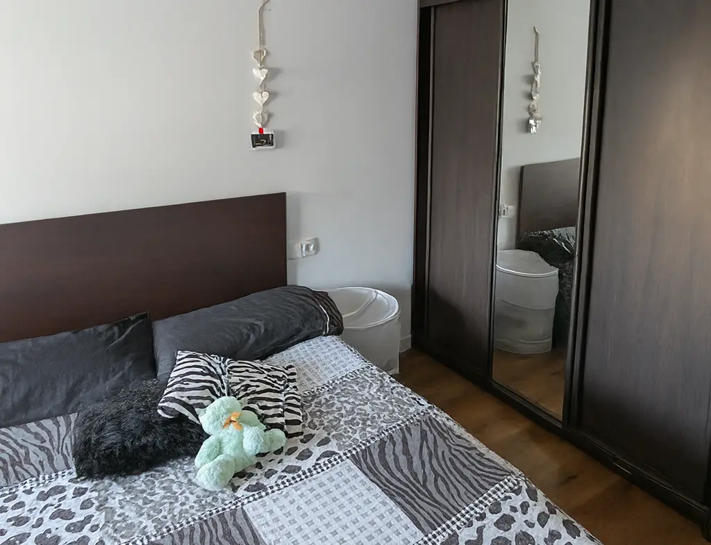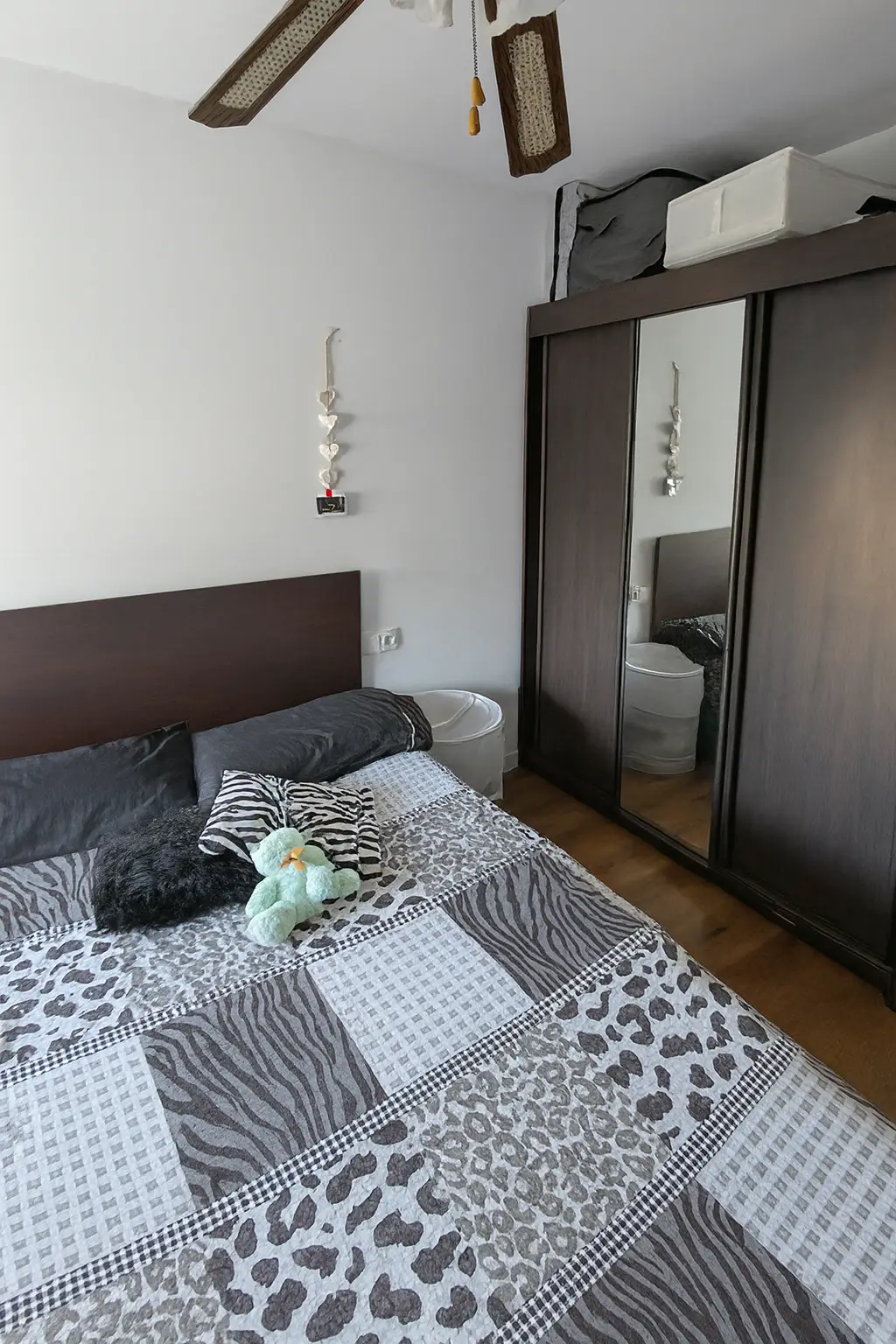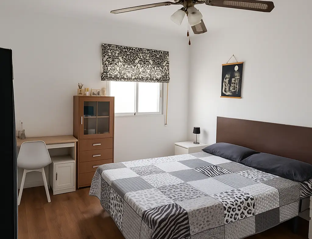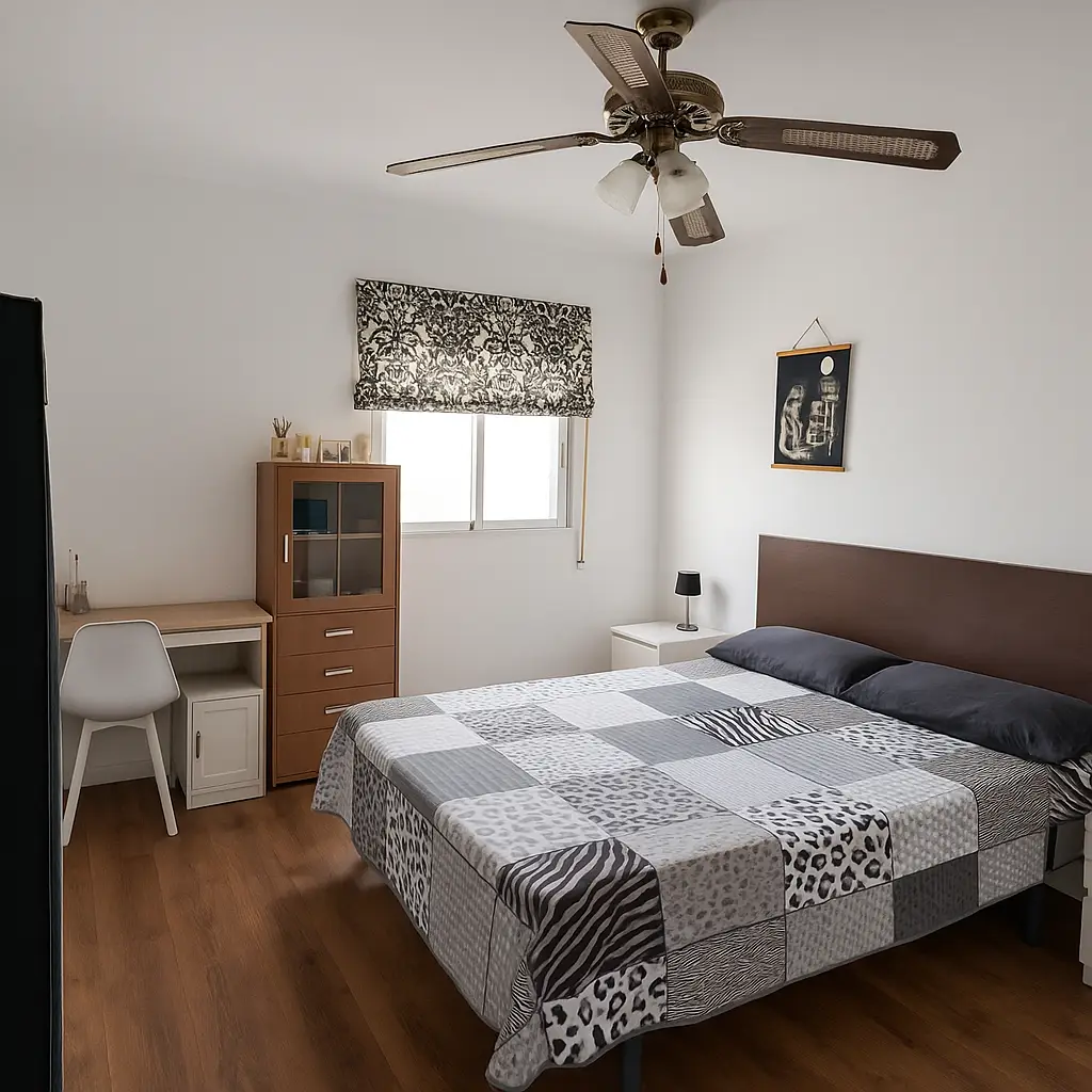 Habitación exterior, luminosa y totalmente amueblada. Dispone de cama individual, escritorio con silla, armario grande, y ventilador de techo. Es un espacio cómodo pensado tanto para descansar como para estudiar o teletrabajar.