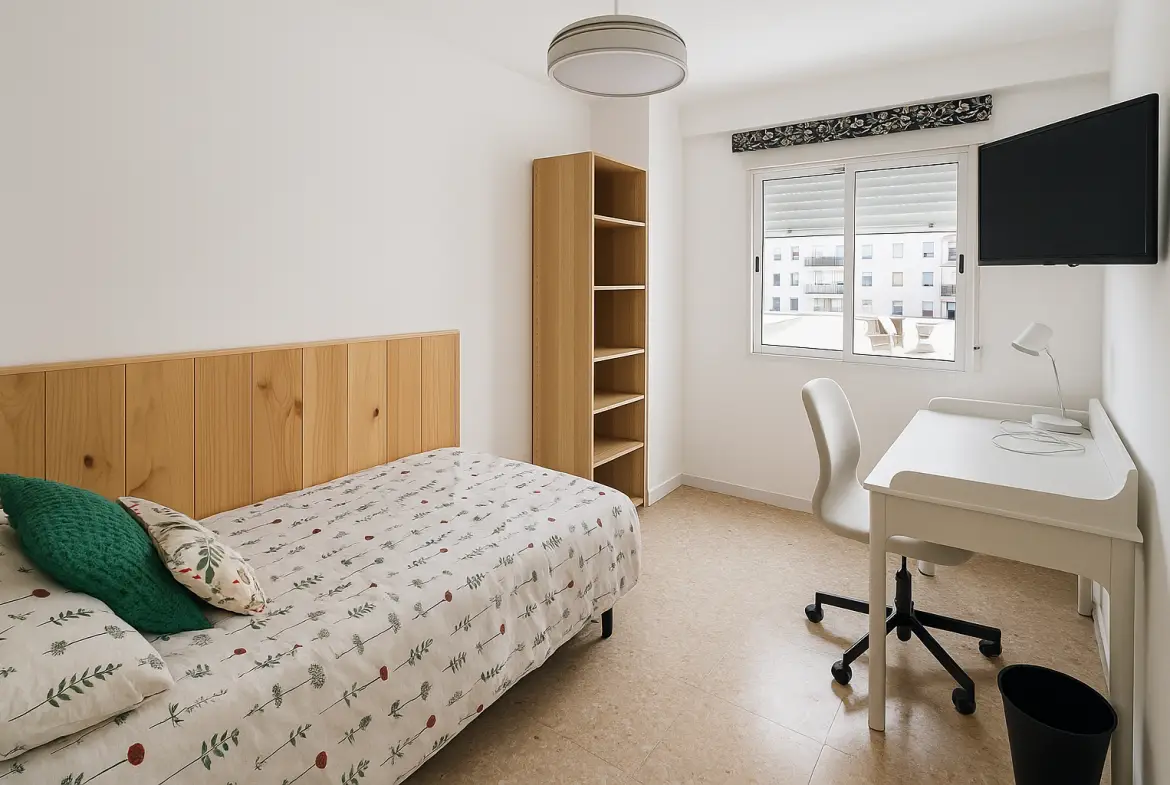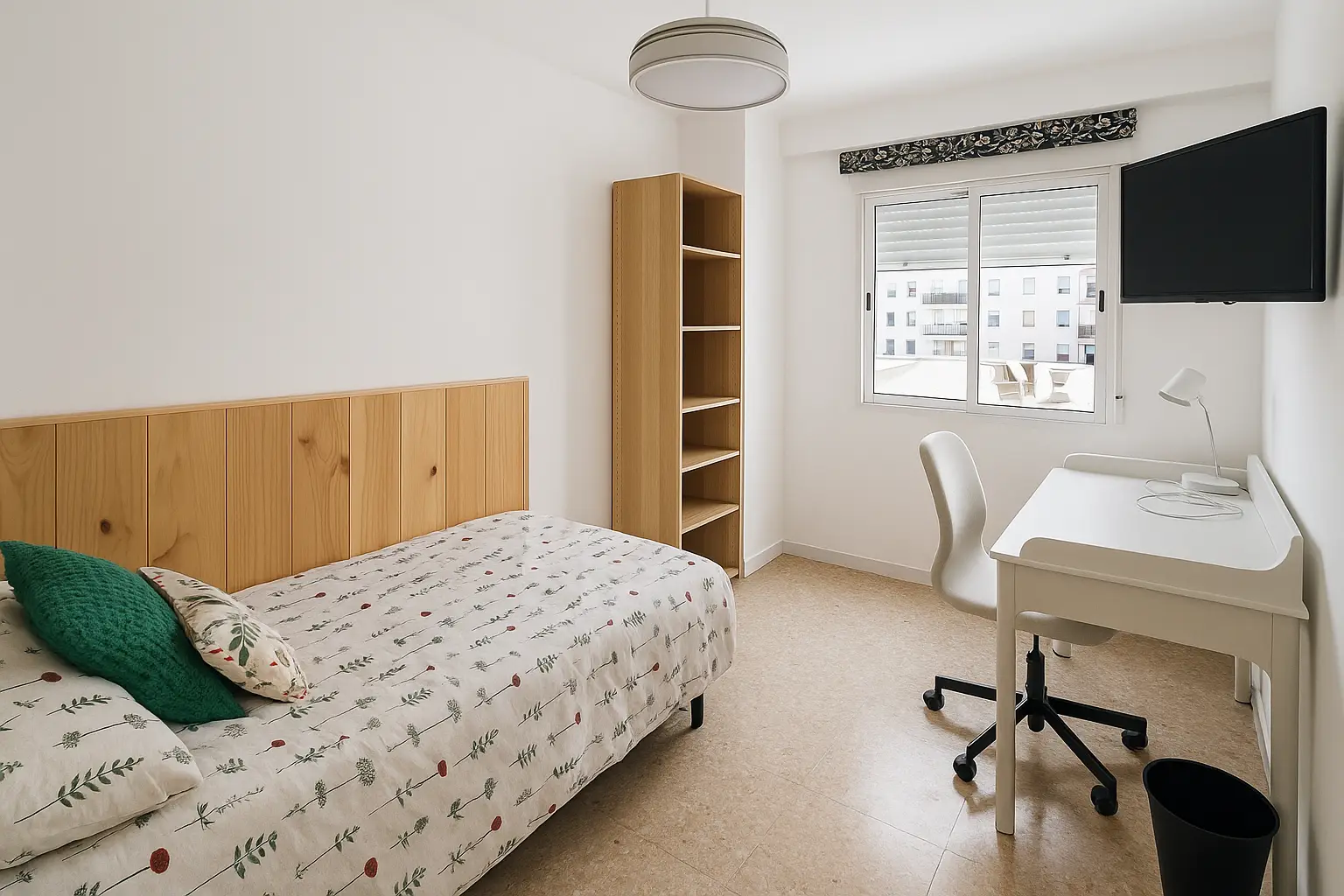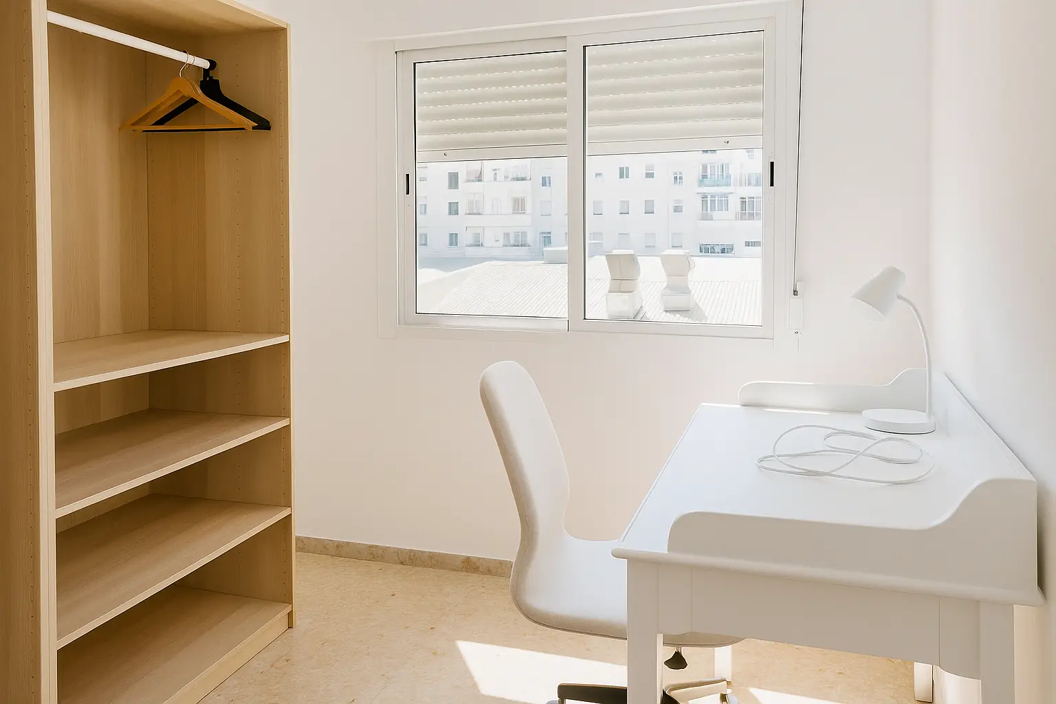 Exterior y luminosa. Amueblada con cama individual con canapé, escritorio con silla ergonómica, armario/columna de almacenaje y ventilador de techo. Ideal para estudiar o teletrabajar en un espacio tranquilo.